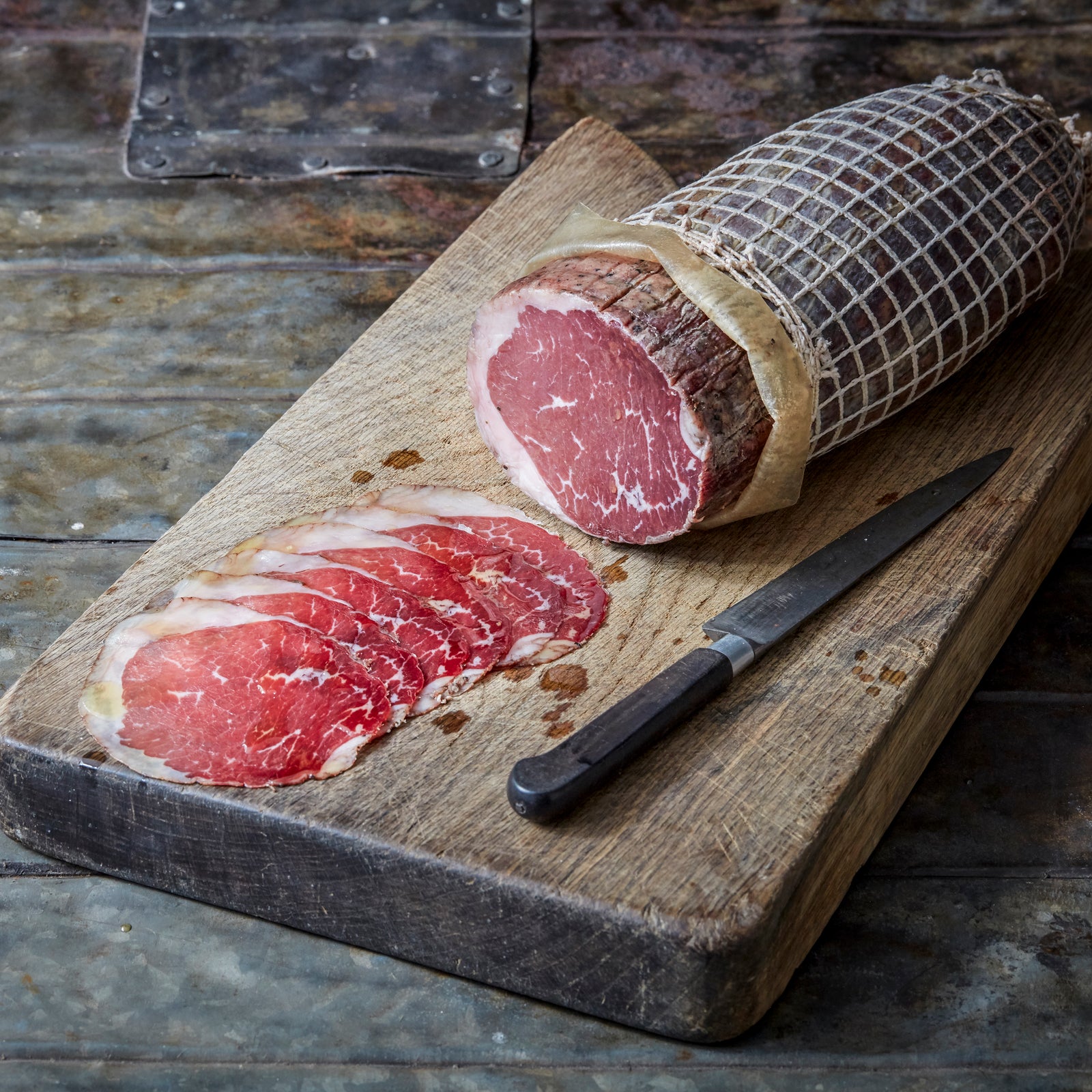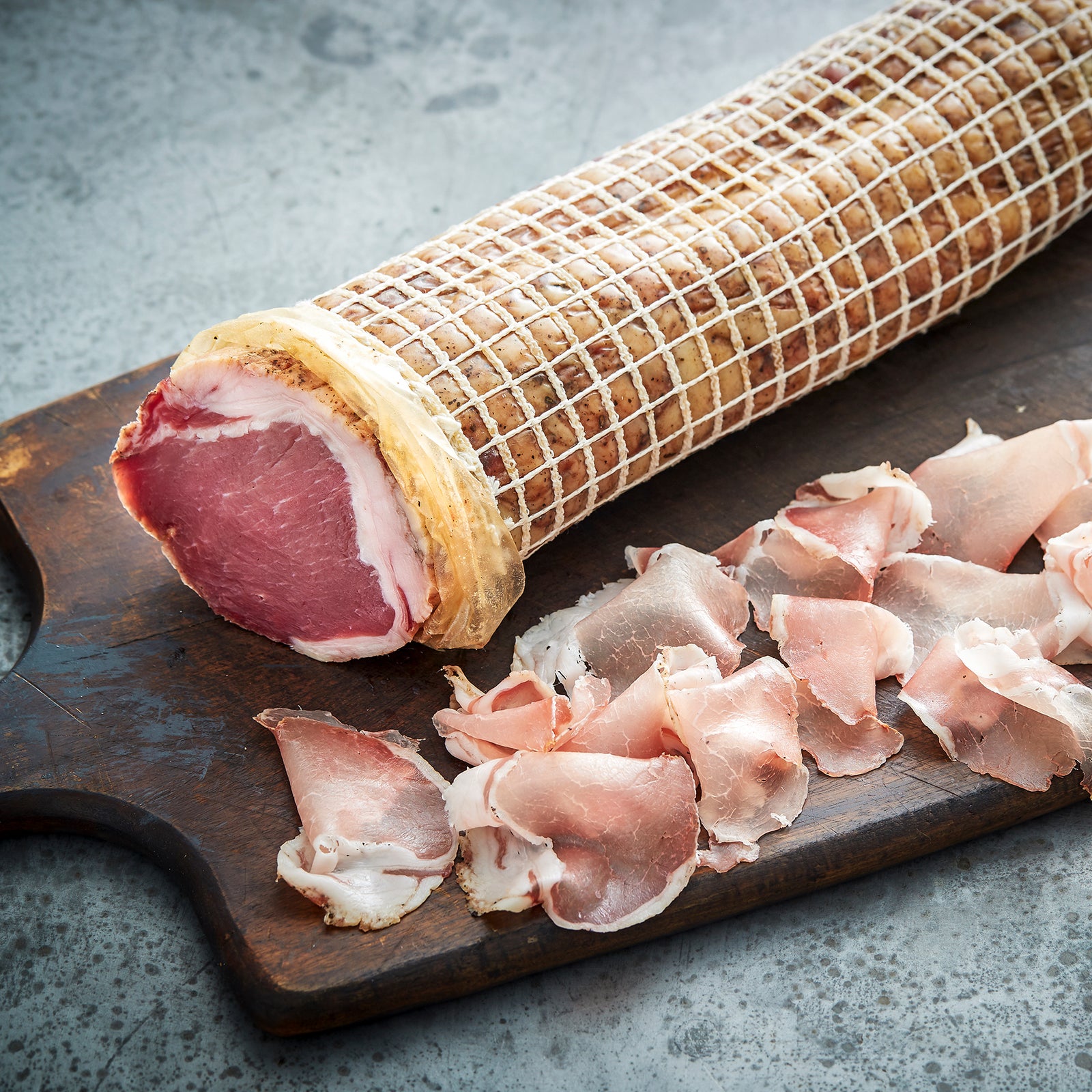 Cured in a sea salt rub with black peppercorns and juniper berries and gently aged, Lonza is similar in both taste and texture to prosciutto. To prepare, remove the casing and thinly slice. A versatile addition to any platter and a delicious partner to a bold red.