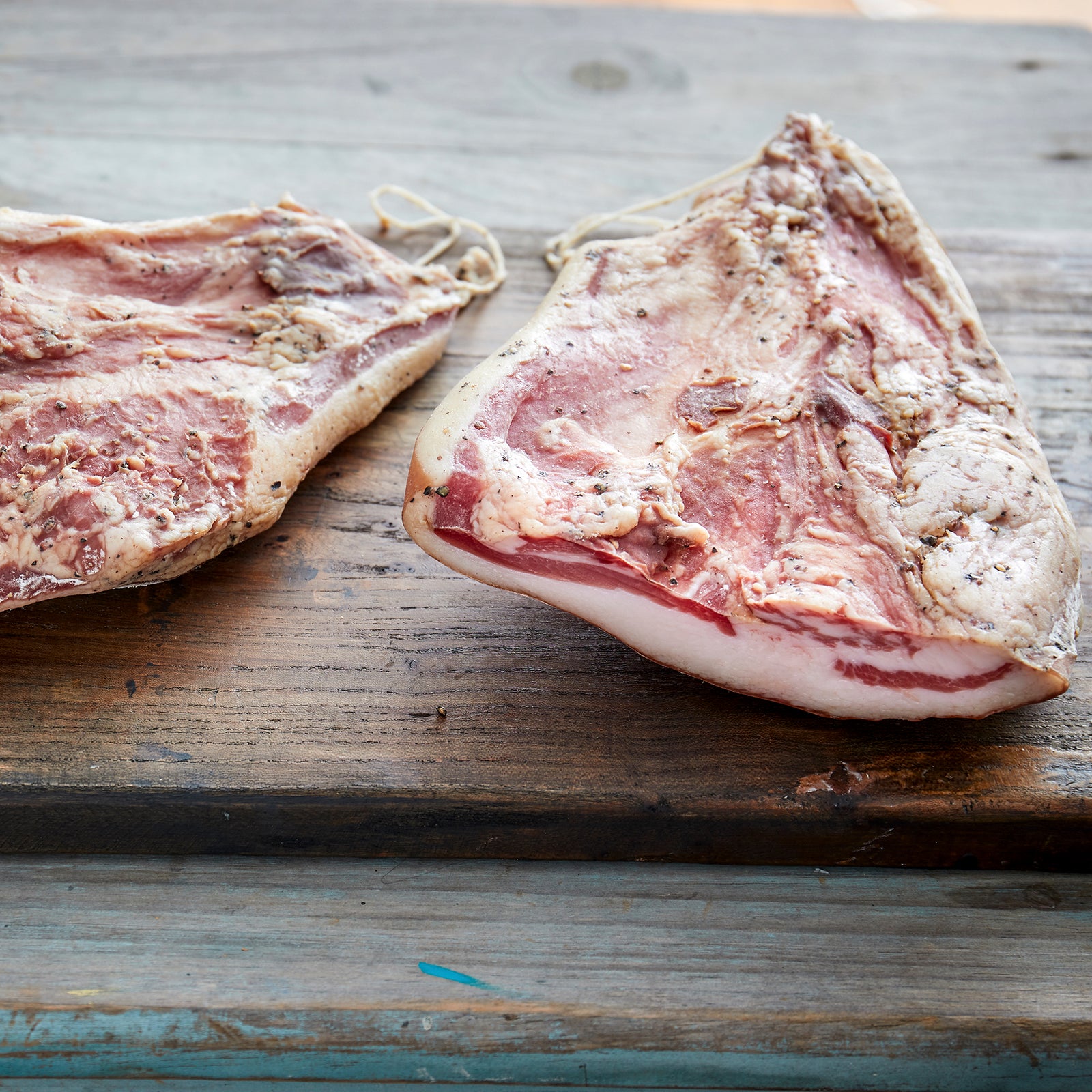 Arguably the tastiest of pork cuts, the cheek guancia requires the rind to be removed prior to thinly slicing while cold. It is the basis of dishes such as pasta alla carbonara, or simply combined with tomatoes, basil and mozzarella to form a classic bruschetta. Accompany with a chilled prosecco.